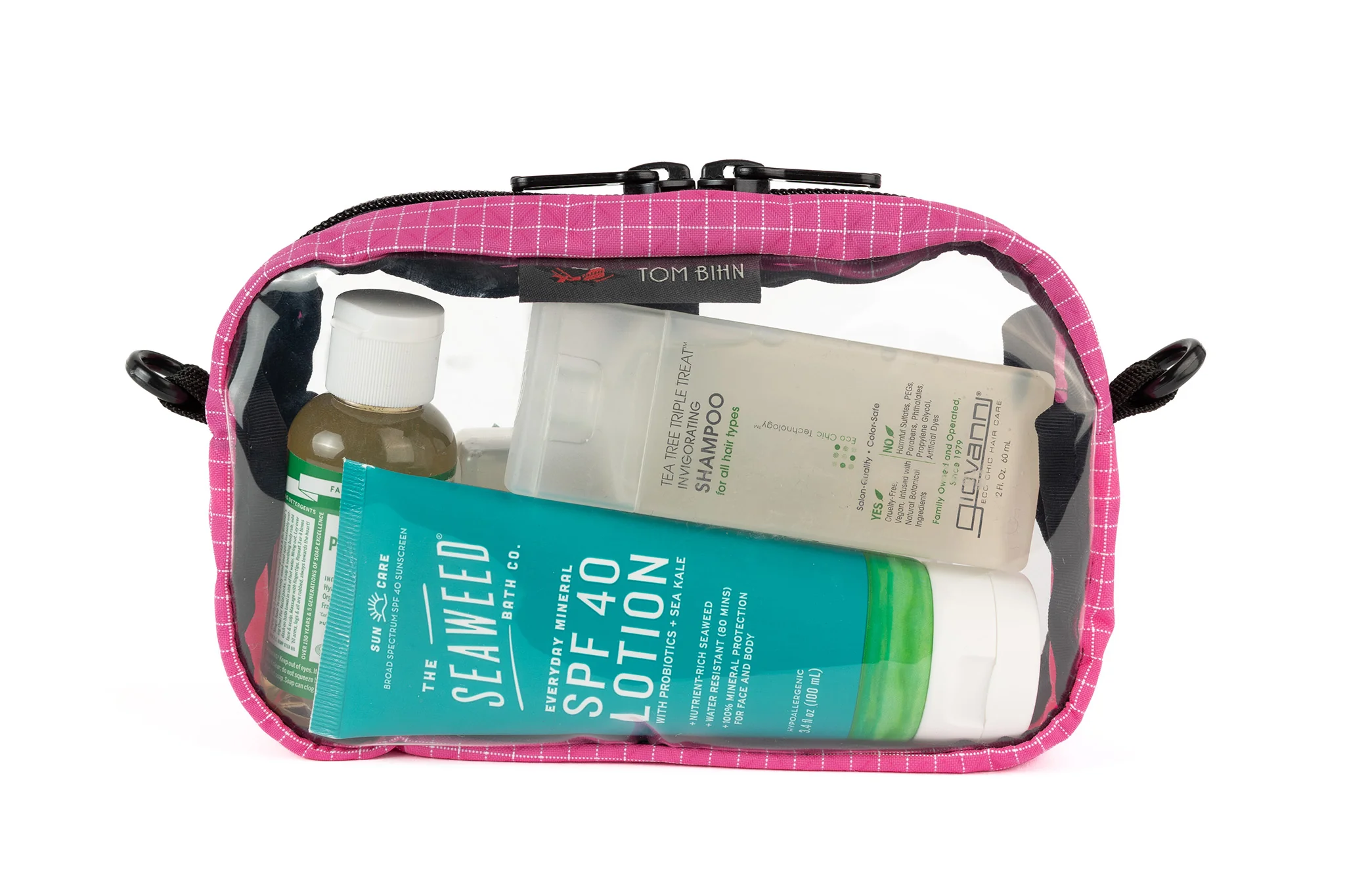 We give you the option of adding a Shoulder Strap to the Clear 3D Organizer Cube, allowing you to hang the Cube from a towel rack or doorknob, or wear it over your shoulder while waiting in the airport security line. The shoulder strap is the same strap included with our Side Effect bag: 5/8" nylon webbing, adjustable, with plastic snaphooks (no pad).