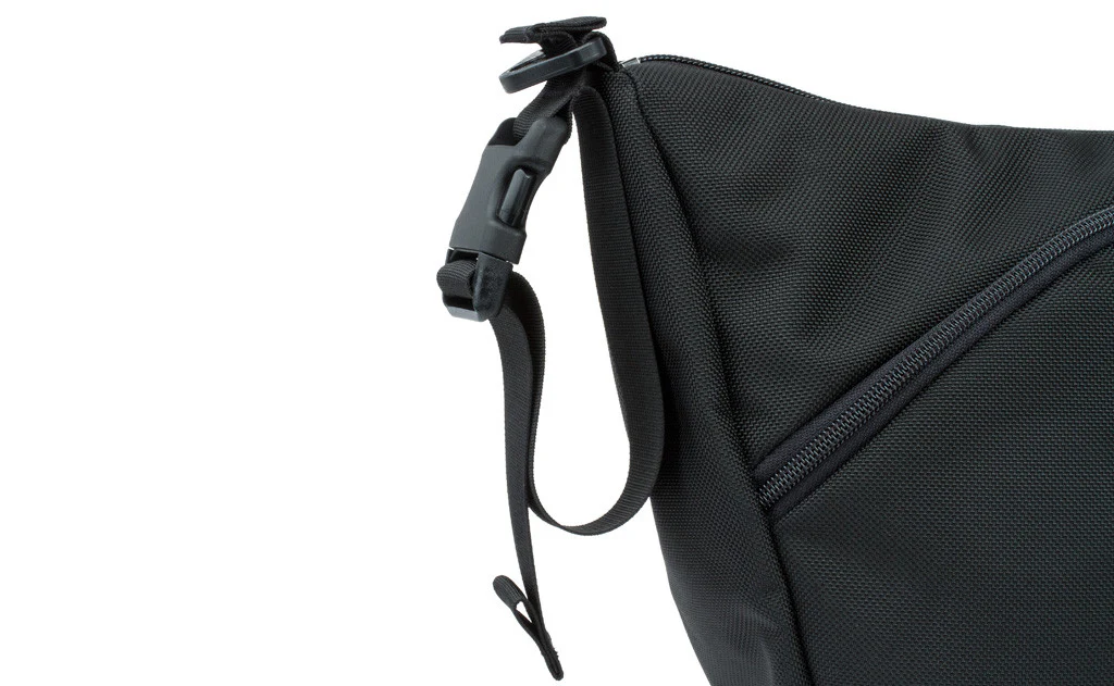 Wheelchair or Stroller Loops attach to our bags through the bag’s plastic triangular “D-ring” part. The Loops don't clip into the circular hole where you’d normally attach a shoulder strap’s snaphook, but rather slips through the slot where the webbing, which affixes the plastic triangle to the bag, passes. This is cool because you needn’t choose between shoulder strap or the loops – you can leave the loops on if you find yourself utilizing them often, and remove the shoulder strap if and when that seems right.