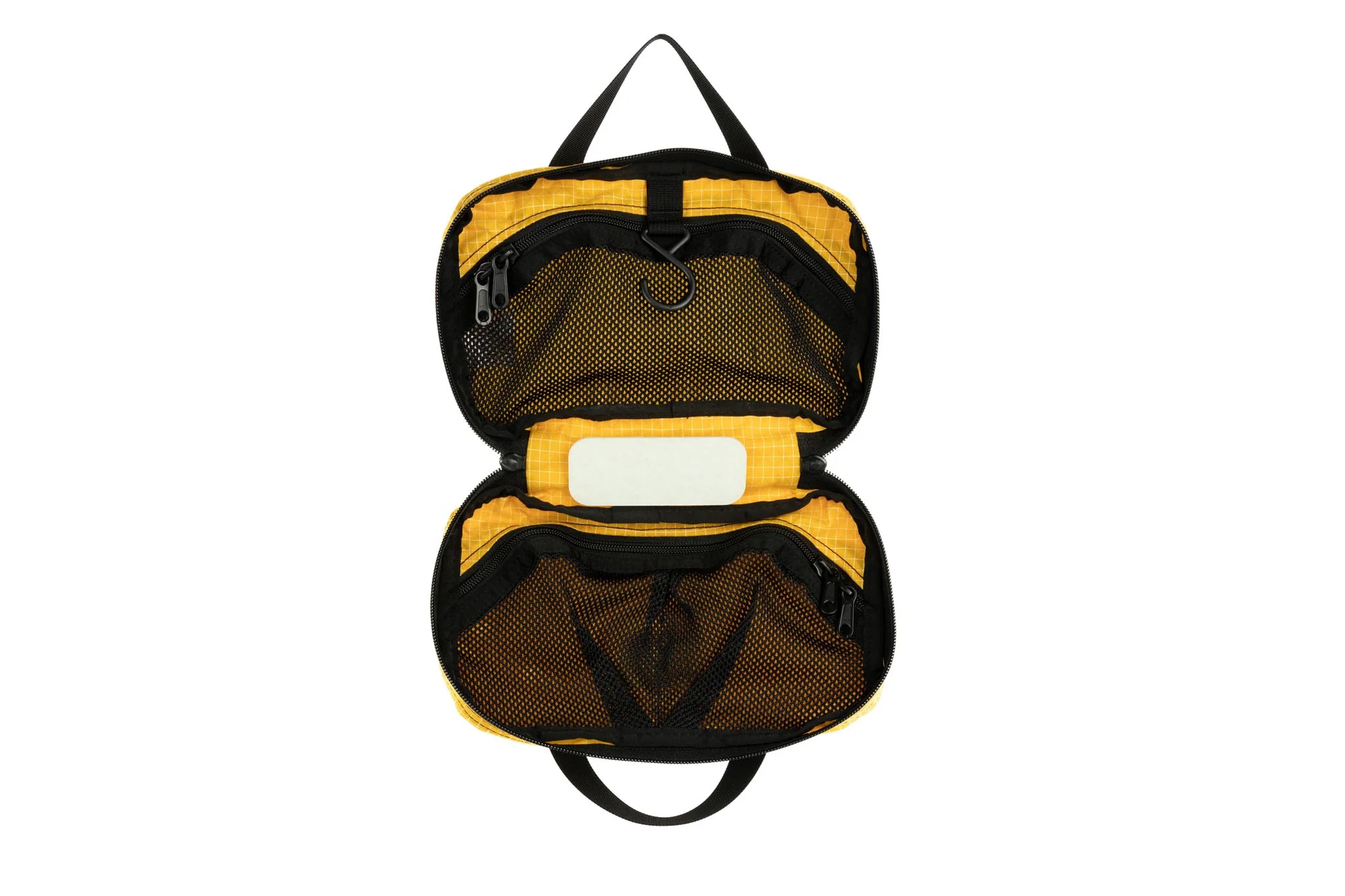We make the Spiff Kit in two sizes/versions: the Standard and the Deluxe. Both feature a divided mesh organizer pouch that will nicely fit most "trial" or "travel" size shampoos, conditioners and liquid soaps, as well as compact travel razors and toothbrushes. The center division of this pouch keeps things organized, yet doesn't overly limit exactly what you can carry. Opposite that (or above it, when the Spiff is unfolded), both versions feature a large-ish, undivided mesh pouch that will take your other miscellaneous toiletries/pharma, or perhaps a small travel towel.